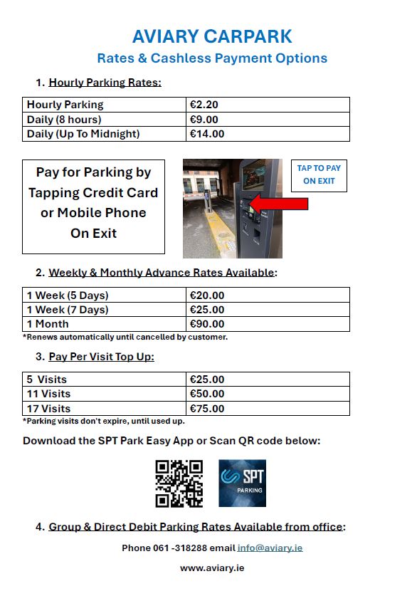 Aviary Car Park Mount Kennett Place Dock Rd. Limerick. Phone: 061 318288